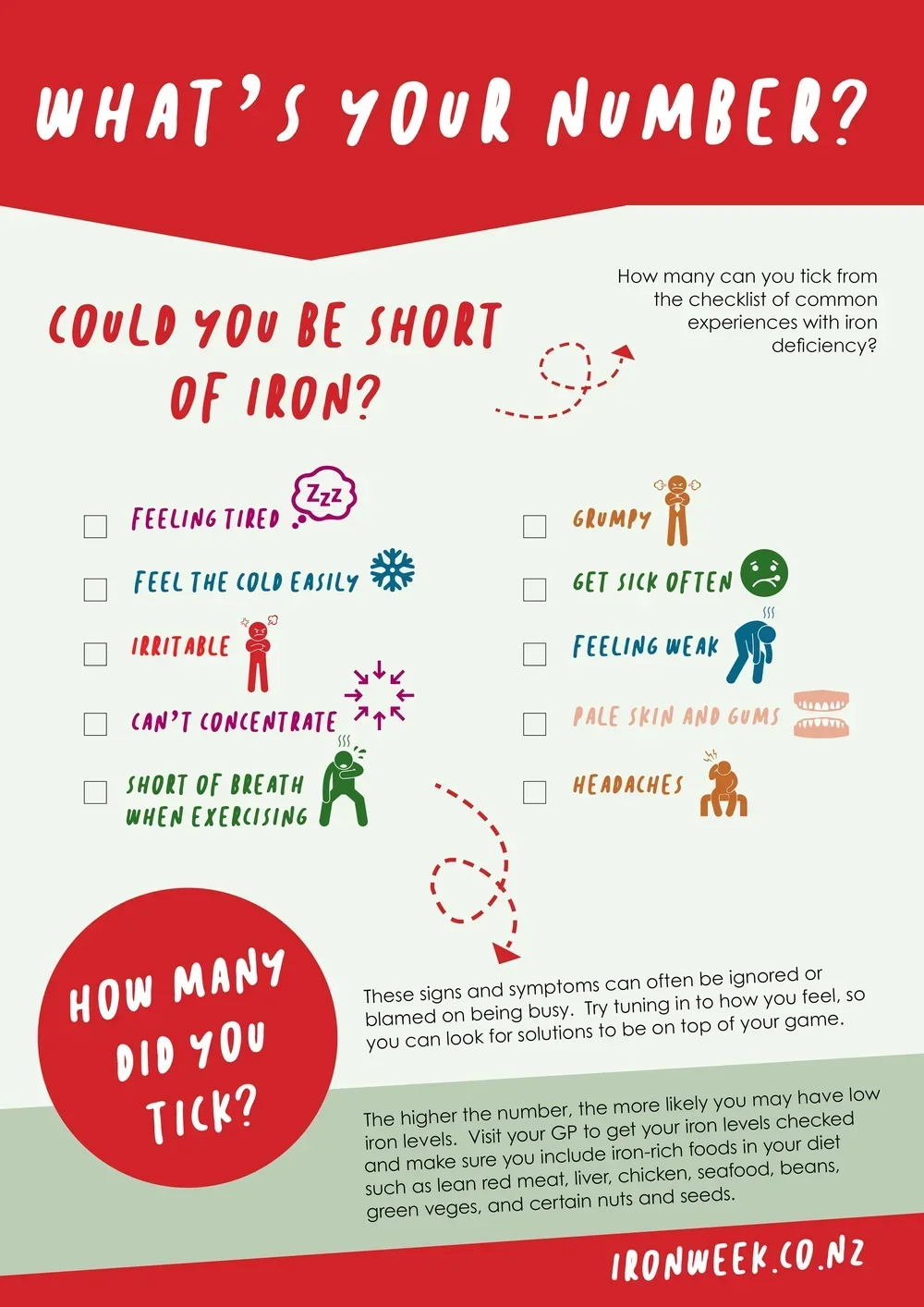 If you're running low on iron, it can feel like your battery's running low. The signs and symptoms can feel like you’re just having a meh day but don't brush them off - your body might be trying to let you know what’s going on. This infographic gives you an easy way to assess common symptoms! If you think this relates to you, talk to your GP about your levels.