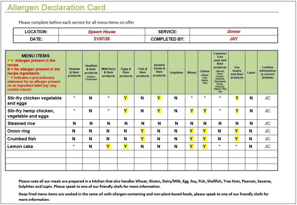 The allergen declaration cards are there to provide such information so that students can identify what allergens are present at each meal and confidently decide on what meals are safe for them and what meals to avoid.